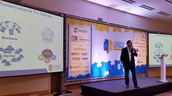 Com o tema ‘ A transformação digital das empresas e o impacto na vida dos CIOs’, Anderson Baldin Figueiredo, ministrou a palestra que encerrou o segundo dia de atividades do III Seminário do Grupo de Gestores de TI do Sul do Brasil (GTISUL). Anderson, que é especialista em Desenvolvimento de Software, Gestão de Equipe, consultor de TIC, estratégia de negócios e inteligência de marketing, possui 40 anos de experiência nas mais diversas áreas de TI e Telecom, incluindo: Desenvolvimento de Aplicações, Serviços Profissionais, os produtos / Solutions Desenvolvimento, Consultor e Inteligência de Mercado. Ele é responsável por firmar programas de parcerias com empresas estrangeiras, para expor produtos em feiras internacionais e implementar projetos nos Estados Unidos, América do Sul (Argentina e Chile) , Europa ( Rússia) , Ásia (Japão) e África ( Moçambique).